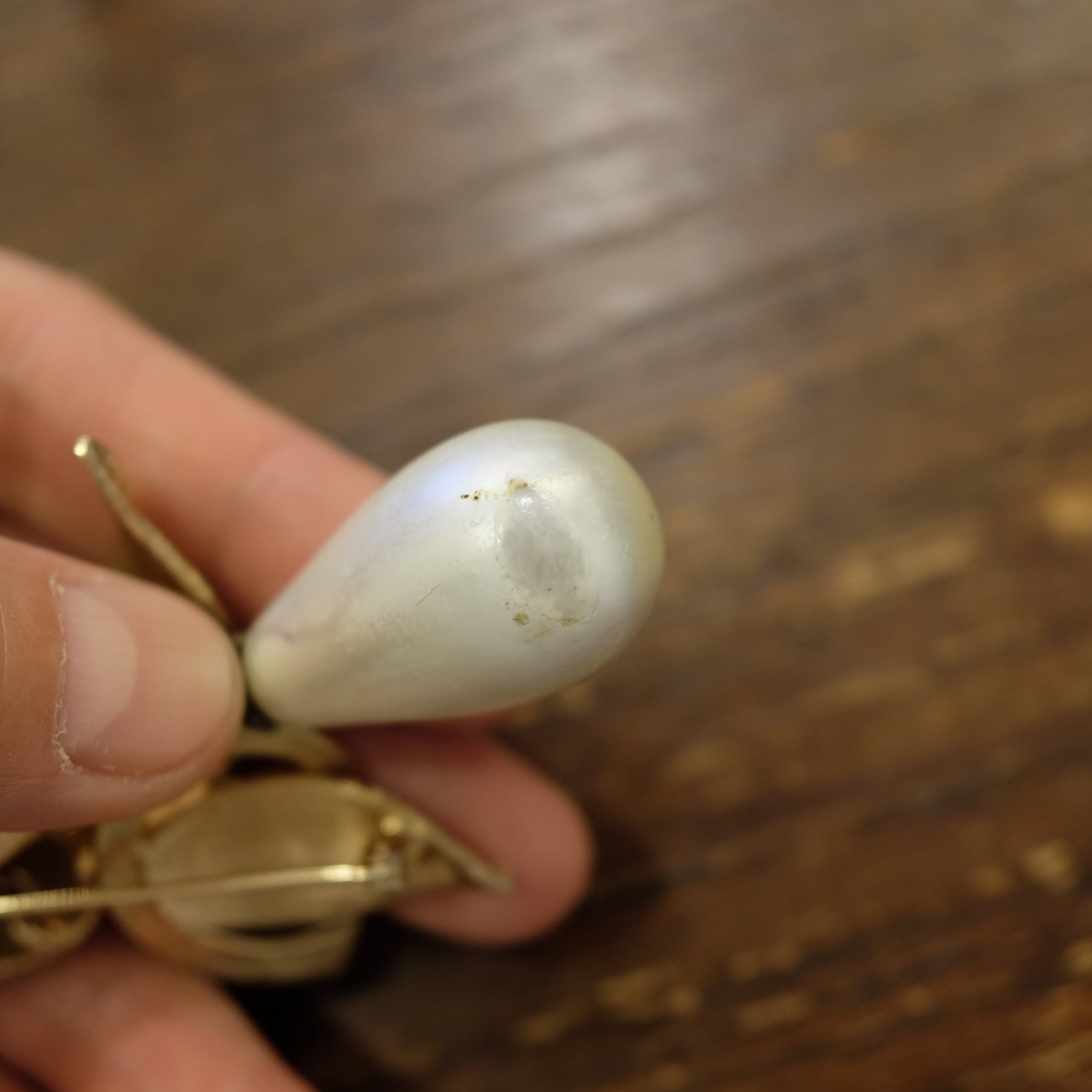 残念ながら、フェイクパールの一部分に経年による剥げがあり、