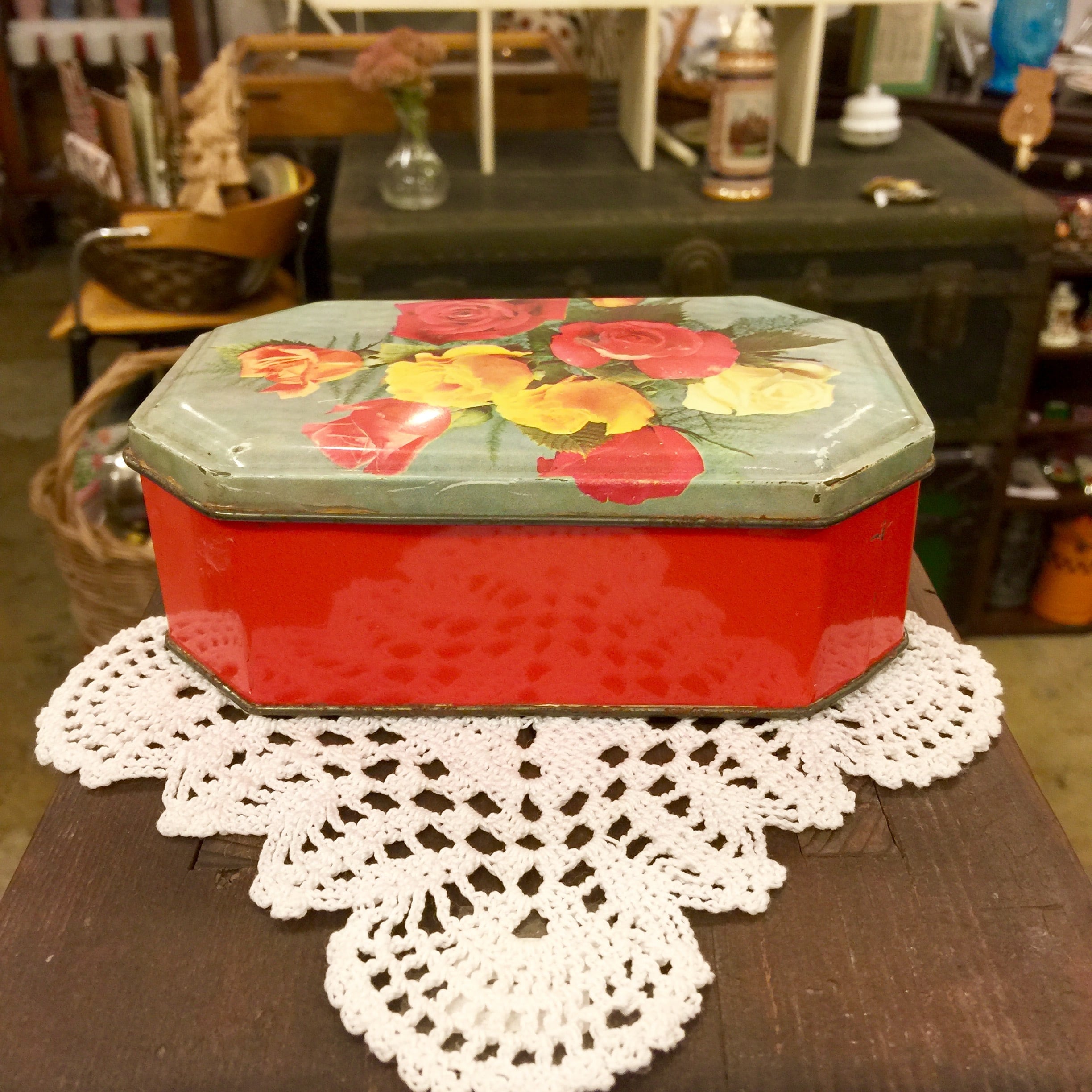 70's Vintage Roses Photo Printed Red Small Tin Box [OV-9]