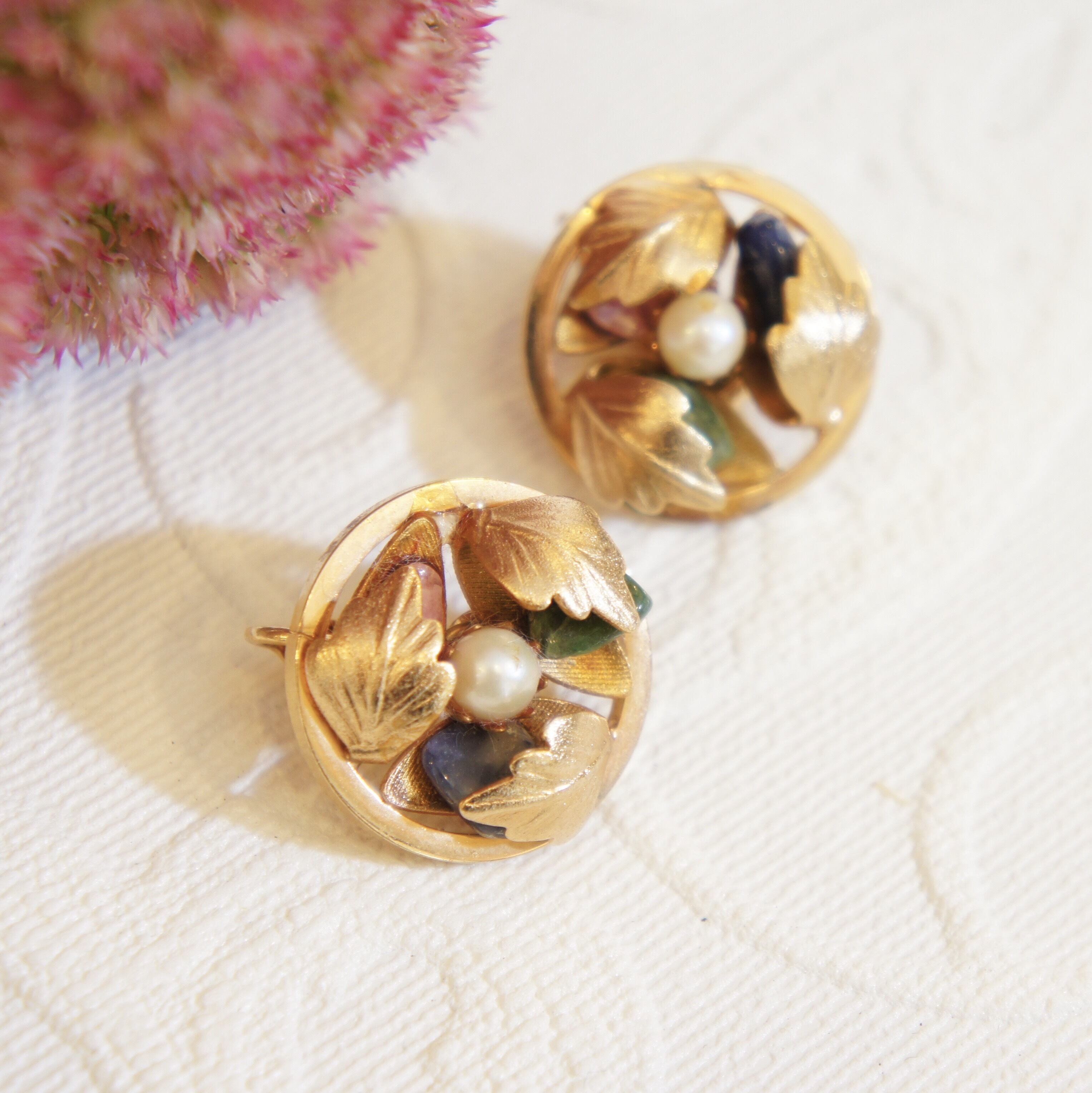 サークル型ゴールドトーンの葉っぱの中に半貴石(ターコイズ等)の石が入った
