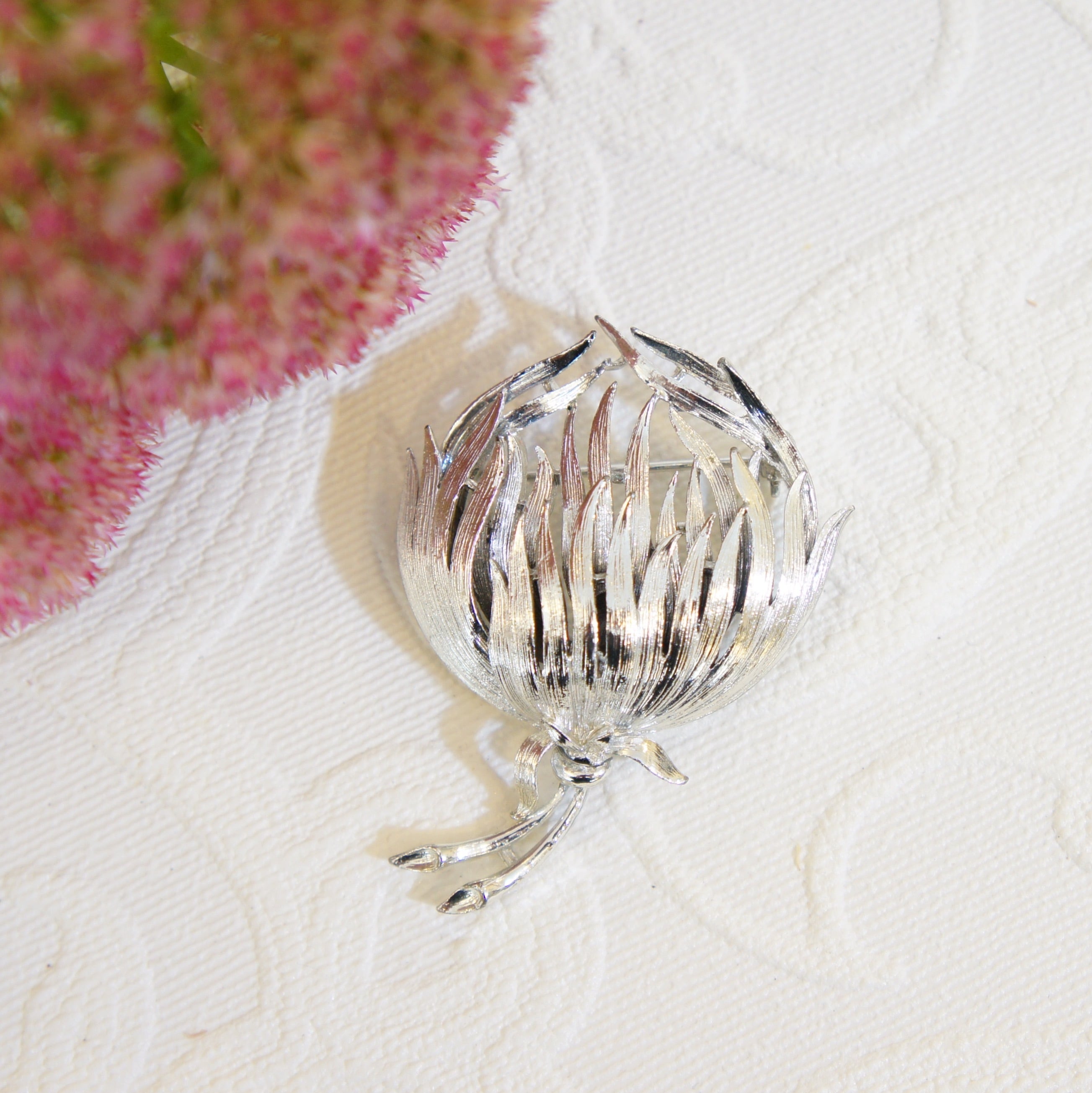 明るめのシルバートーンの花の蕾のようなデザインの50年代くらいのヴィンテージブローチです。