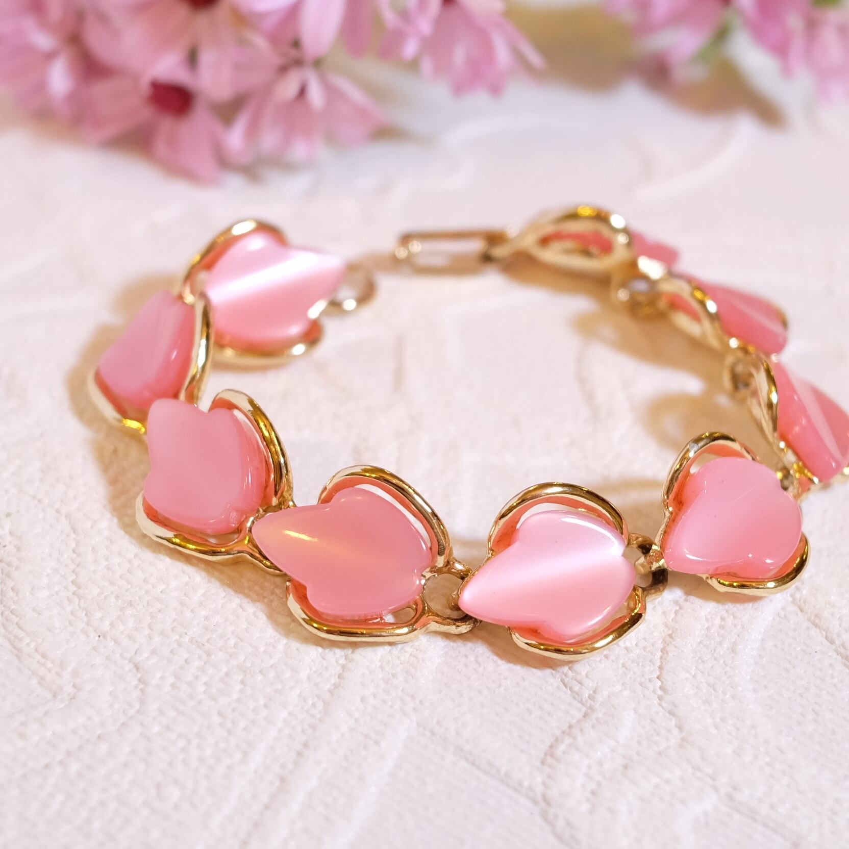春らしいピンク色の葉っぱが連なったデザインの60〜70年代ヴィンテージブレスレットのご紹介です。